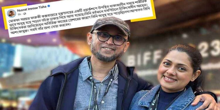 তিশা লিখেছেন, ‘মোস্তফা সরয়ার ফারুকী কক্সবাজারে মন্ত্রণালয়ের একটি ওয়ার্কশপে অংশগ্রহণ করছিলেন। সেখানে শারীরিক অসুস্থতার কারণে তাকে দ্রুত ঢাকায় আনা হয়। বর্তমানে তিনি হসপিটালে চিকিৎসাধীন আছেন। চিকিৎসকরা জানিয়েছেন, অতিরিক্ত কাজের চাপের কারণে তিনি অসুস্থ হয়ে পড়েন। তবে এখন তিনি আশঙ্কামুক্ত। সবাই তার জন্য দোয়া করবেন।’