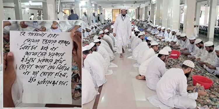পাগলা মসজিদের দানবাক্সে আবারো পাওয়া গেলো অবিশ্বাস্য পরিমাণ টাকা ও এক নতুন চিঠি। শনিবার (৩০ আগস্ট) সকাল সাতটার দিকে মসজিদের ১৪টি দানবাক্স খুলে পাঠানো হয় ৩২ বস্তা অর্থ। এসব টাকা গণনা চলাকালে দেখা যায়, এর সঙ্গে রয়েছে অসংখ্য চিঠি, যার মধ্যে লেখা হয়েছে, নির্বাচন চাই না, আমাদের দরকার ইউনুস সরকার। চিঠির ভাষায় বলা হয়েছে, হে পাগলা বাবা, তোমার দোয়ার বরকতে নির্বাচন চাই না। তুমি দোয়া করো যেন নির্বাচন না হয়। সাধারণ মানুষ এই বার্তাটি পাঠিয়েছে।