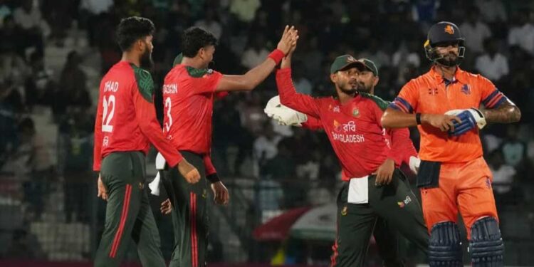 ম্যাক্স ও’ডাউডকে ৮ রানে ফিরিয়ে দেন নাসুম। এরপর জোড়া আঘাত করেন তাসকিন আহমেদ, যার ফলে পাওয়ার প্লে’তেই তিন উইকেট পড়ে যায় নেদারল্যান্ডসের। বিপর্যয় এড়াতে পারেনি তারা, কারণ নিয়মিত উইকেট হারাতে থাকায় ১০০র নিচে পৌঁছানোর আগেই তারা অলআউট হয়ে যায়।