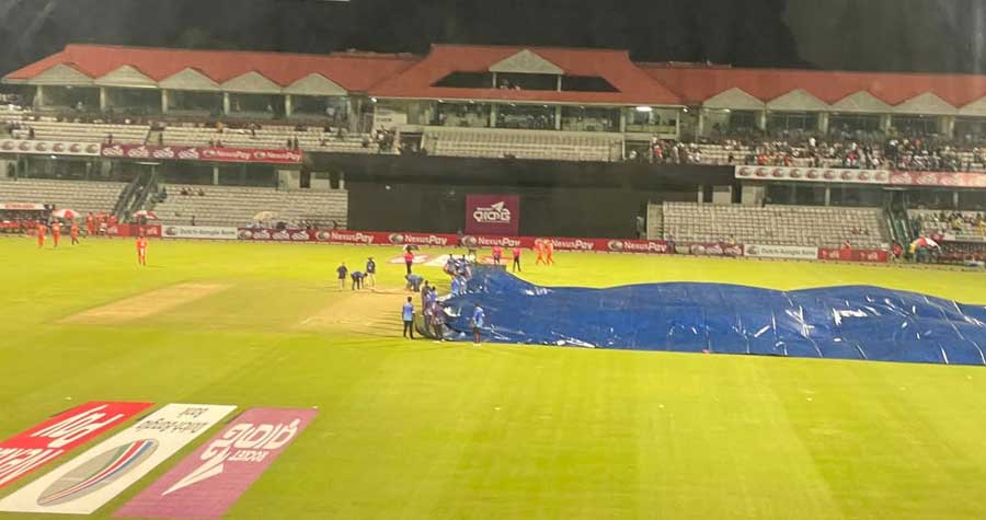 বাংলাদেশের শুরুটা ভালো হলেও বৃষ্টি এসে খেলা বন্ধ করে দেয়। খেলা চলার সময়ই পঞ্চম ওভারে বৃষ্টি শুরু হয়। বৃষ্টির কারণে উইকেট একটু স্লো হয়ে যায়, যার ফলে রান তুলতে সমস্যা হয়। তবে লিটন দাস এই দুর্যোগে তার ব্যক্তিগত ফিফটি তুলে নেন ২৭ বলে।