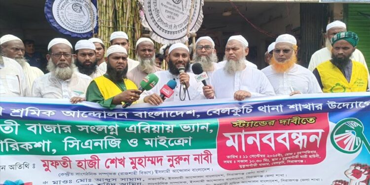 সিরাজগঞ্জের বেলকুচি উপজেলায় ভ্যান, অটোরিকশা, সিএনজি ও মাইক্রোবাস চালকদের ন্যায্য দাবি আদায়ের জন্য ইসলামী শ্রমিক আন্দোলন বাংলাদেশ, বেলকুচি থানা শাখার উদ্যোগে এক মানববন্ধন কর্মসূচি অনুষ্ঠিত হয়েছে। এই মানববন্ধনটি অনুষ্ঠিত হয় বৃহস্পতিবার (১১ সেপ্টেম্বর) সকাল সাড়ে ১০টার দিকে মুকুন্দগাঁতী যাত্রী ছাউনিতে।