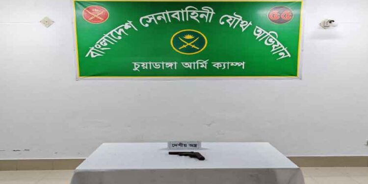 চুয়াডাঙ্গা সদর উপজেলার শংকর চন্দ্র ইউনিয়নের ছয়ঘড়িয়া গ্রামে সেনা বাহিনীর অভিযান চালিয়ে একটি দেশীয় পিস্তল উদ্ধার করা হয়েছে। সেনা সূত্র জানায়, সুনির্দিষ্ট গোয়েন্দা তথ্যের ভিত্তিতে বুধবার (২৪ সেপ্টেম্বর) গভীর রাত থেকে ভোর পর্যন্ত ক্যাম্প কমান্ডার ক্যাপ্টেন মঞ্জুরুল রহমান মাসফির নেতৃত্বে এ অভিযান পরিচালিত হয়। এই সময় স্থানীয় বাসিন্দা সালতাম হোসেনের ছেলে জাইরুল ইসলামের বাড়ির গোয়ালঘর তল্লাশি করে একটি দেশীয় পিস্তল ও একটি মোটরসাইকেল জব্দ করা হয়। তবে অভিযুক্ত জাইরুল ইসলাম পলাতক থাকায় তাকে আটক করতে পারেনি সেনা বাহিনী। উদ্ধারকৃত অস্ত্র ও জব্দ সামগ্রী পরে চুয়াডাঙ্গা সদর থানায় পুলিশের নিকট হস্তান্তর করা হয়েছে। বাংলাদেশ সেনাবাহিনী জানায়, জননিরাপত্তা রক্ষা, আইনশৃঙ্খলা বজায় রাখা ও অপরাধ দমনকে কেন্দ্র করে তাদের নিয়মিত এই ধরনের অভিযান চালানো হয়। ভবিষ্যতেও এ ধরনের অভিযান অব্যাহত থাকবে বলে তারা নিশ্চিত করেছে।