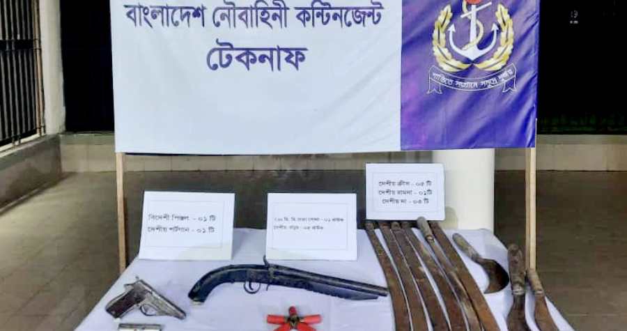 কক্সবাজারের টেকনাফে চালানো এক বিশেষ অভিযানে নৌবাহিনীর দল বিপুল পরিমাণ অস্ত্র ও গোলাবারুদ উদ্ধার করেছে। অভিযানে ১টি ৭.৬২ মিমি বিদেশি পিস্তল, একটি তাজা পিস্তল বল, একটি দেশীয় শটগান, পাঁচ রাউন্ড শটগানের তাজা কার্তুজ এবং নয়টি দেশীয় তৈরি ধারালো অস্ত্র উদ্ধার করা হয়।