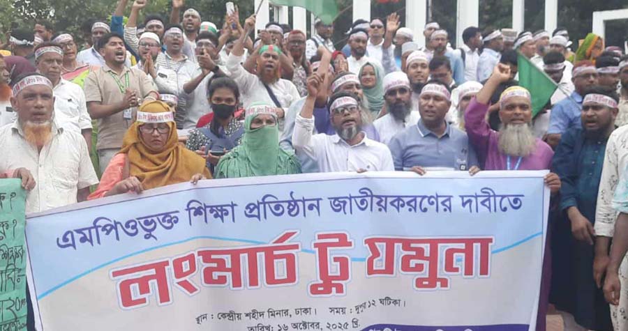 বেসরকারি শিক্ষাপ্রতিষ্ঠানের এমপিওভুক্ত শিক্ষক ও কর্মচারীরা পঞ্চম দিনের মতো ধারাবাহিক আন্দোলন চালিয়ে যাচ্ছেন। তাদের মূল দাবি হলো, যে সমস্ত শিক্ষকদের মূল বেতন থেকে ২০ শতাংশ বাড়ি ভাড়া দেওয়া হচ্ছে তা অবিলম্বে কার্যকর করতে হবে, এবং একই সঙ্গে ১৫০০ টাকা মেডিকেল ভাতা ও ৭৫ শতাংশ উৎসব ভাতার প্রজ্ঞাপন জারি করতে হবে। শিক্ষকদের এই আন্দোলনের অংশ হিসেবে তারা বৃহত্তর পরিকল্পনার অধীনে ‘মার্চ টু যমুনা’ কর্মসূচির প্রস্তুতি নিচ্ছেন, যা আজ যদি তাদের দাবি আদায় না হয়, তখন তারা প্রধান উপদেষ্টার বাসভবনের দিকে লং মার্চের ঘোষণা দিয়েছেন।