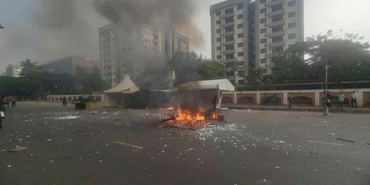 সংঘর্ষের সময় বাইরে থাকা অংশটি ভেঙে গেট ভেঙে ভেতরে প্রবেশ করে। এরপর আন্দোলনকারীরা পুলিশকে লক্ষ্য করে বোতল, চেয়ার নিক্ষেপ করে। পুলিশ তখন সাউন্ড গ্রেনেড ও টিয়ারশেল ছুঁড়ে তাদের ছত্রভঙ্গ করার চেষ্টা করে। এই সময় সড়কে আগুন লাগে এবং ইট-পাটকেল ছোড়াছুড়ি চলে। বেশ কিছু পুলিশি গাড়ি ভাঙচুরের ঘটনাও ঘটে। সংঘর্ষে বেশ কয়েকজন আহত হয়েছে বলে জানা গেছে।