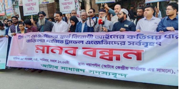 শনিবার (১৫ নভেম্বর) সকাল সাড়ে ১০টায় রাজধানীর হোটেল ভিক্টরি রোডের সামনে আটাবের সদস্যরা মানববন্ধন করেন। সেখানে তারা নাড়ির স্বার্থের বিষয়টি তুলে ধরে বিভিন্ন স্লোগান দেন, যেমন- “যে আইন জীবনযোড়ায় বাঁধা সৃষ্টি করে, তা জনগণের জন্য নয়”, “বিটুবি বন্ধ নয়, সমাধান চাই” এবং “আমরা ভ্যাট দিই, ট্যাক্স দিই, তবুও কেন আমাদের ব্যবসা বন্ধের আইন”। তারা আরও দাবি করেন, সকল ট্রাভেল এজেন্সীর জন্য উড়োজাহাজ টিকিট উন্মুক্ত করতে হবে এবং অবিলম্বে এই খসড়ার চাপিয়ে দেওয়া কিছু বিধান বাতিল করতে হবে।