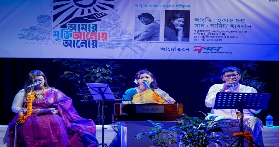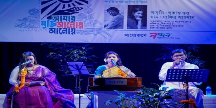 জীবনযাত্রায় নাগরিক জীবনের নানা ক্লান্তি আর চাপের মধ্যে হেমন্তের আগমন যেন এক প্রশান্তির বাতাস নিয়ে আসে। শহরের অলিগলিতে শীতের কোমল স্পর্শ ধীরে ধীরে বিকাশ লাভ করে, যা নাগরিক জীবনে কিছুটা স্বস্তি এবং শান্তির পরশ বুলিয়ে দেয়। এই সুন্দর মৌসুমের এক উজ্জ্বল আয়োজন হলো সাংস্কৃতিক সংগঠন নন্দনের আয়োজনে শনিবার (২২ নভেম্বর) সন্ধ্যায় রাজধানীর ছায়ানটের প্রাঙ্গণে অনুষ্ঠিত ‘আমার মুক্তি আলোয় আলোয়’ আবৃত্তি ও গানের যুগল সম্মিলন। এই অনুষ্ঠানে অংশ নেন প্রখ্যাত আবৃত্তিশিল্পী ও সংগঠক সুকান্ত গুপ্ত এবং সংগীতশিল্পী ও শিক্ষক সামিয়া আহসান, যারা সমাপ্তিতে দর্শকদের মন জুড়িয়ে দেন। আবৃত্তিশিল্পী বর্ষা চৌধুরীর সঞ্চালনায় অনুষ্ঠানের শুরুতেই উপস্থিত অতিথিদের স্বাগত জানান নন্দনের উপদেষ্টামণ্ডলীর সদস্য জয়ন্ত রায়। উদ্বোধনী পর্বে নাজমুল আহসানের পরিচালনায় ‘শব্দকল্পদ্রুম’ ও মেহেদী হাসান আকাশের এর পরিচালনায় ‘বাংলা আমার’ শীর্ষক পরিবেশনা দর্শকদের দ jawsে মোহিত করে।