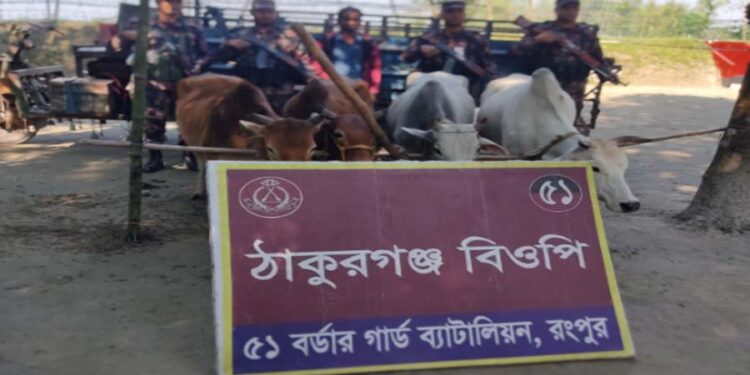 নীলফামারীর ডিমলায় ভারতের ঠাকুরগঞ্জ সীমান্তের বিওপি এলাকায় রংপুর ব্যাটালিয়নের (বিজিবি) অধীনস্থ ঠাকুরগঞ্জ বিওপির টহল দল একটি চোরাচালানকারীসহ কয়েকটি গবাদি পশু ও নসিমন গাড়ি আটক করেছে। বিজিবি রংপুর ব্যাটালিয়নের পক্ষ থেকে জানানো হয়, সীমান্ত সুরক্ষা, মাদকের অবৈধ প্রবেশ প্রতিরোধ, এবং আন্তর্জাতিক অপরাধ দমন নিয়ে তারা নিরলসভাবে কাজ করে চলেছেন। এ ধারাবাহিকতায়, বুধবার ভোরে (২৬ নভেম্বর) পৌনে ৬টার দিকে নীলফামারীর ডিমলা উপজেলার সীমান্তের জুগীরডাঙ্গা মাদ্রাসার মোড়ের কাছাকাছি স্থান থেকে এই অভিযান চালানো হয়। এই সময়, ভারতীয় গরুর সাথে একটি নসিমন গাড়ি, এবং অন্য চোরাচালানকারীকে আটক করা হয়েছে। আটককৃতের নাম মো. মতি মিয়া (৩৫), তিনি কালিগঞ্জ গ্রামের মরসালিনের ছেলে। এ সময় পালিয়ে যায় আরও দুই চোরাকারবারি—সাহাবুরের ছেলে মো. মোসালিন (৩৪) এবং হোসেন আলীর ছেলে নুরুল আমিন (৩৭)। প্রিূটের মূল্য প্রায় ৬ লক্ষ ৯০ হাজার ৫ শত টাকা বলে ধারণা করা হচ্ছে। এই ঘটনায় ডিমলা থানায় একটি মামলা দায়ের করা হয়েছে। ডিমলা থানার অফিসার ইনচার্জ মো. ফজলে এলাহী বলেন, আটককৃত মতি মিয়াকে থানায় সোপর্দ করা হয়েছে এবং তার বিরুদ্ধে আইনানুসারে ব্যবস্থা নেওয়া হচ্ছে। ভবিষ্যতেও এই ধরনের চোরাচালান রোধে তারা সতর্কতা অব্যাহত রাখবেন।