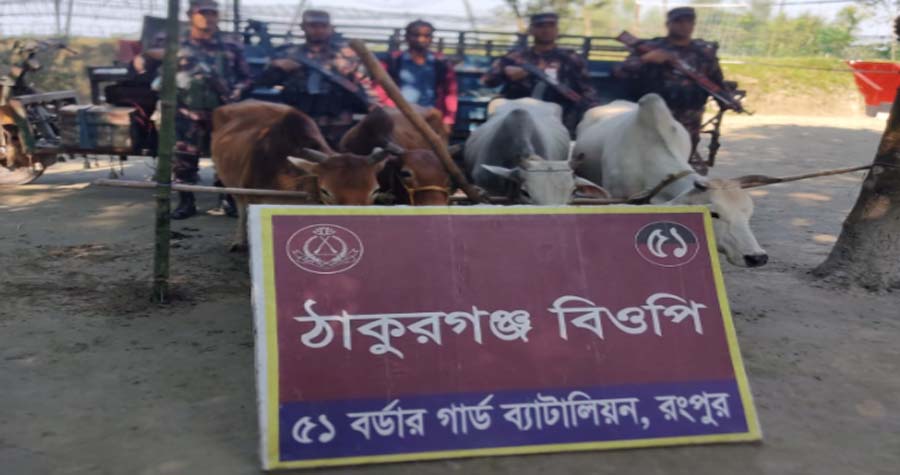 নীলফামারীর ডিমলায় ভারতের ঠাকুরগঞ্জ সীমান্তের বিওপি এলাকায় রংপুর ব্যাটালিয়নের (বিজিবি) অধীনস্থ ঠাকুরগঞ্জ বিওপির টহল দল একটি চোরাচালানকারীসহ কয়েকটি গবাদি পশু ও নসিমন গাড়ি আটক করেছে। বিজিবি রংপুর ব্যাটালিয়নের পক্ষ থেকে জানানো হয়, সীমান্ত সুরক্ষা, মাদকের অবৈধ প্রবেশ প্রতিরোধ, এবং আন্তর্জাতিক অপরাধ দমন নিয়ে তারা নিরলসভাবে কাজ করে চলেছেন। এ ধারাবাহিকতায়, বুধবার ভোরে (২৬ নভেম্বর) পৌনে ৬টার দিকে নীলফামারীর ডিমলা উপজেলার সীমান্তের জুগীরডাঙ্গা মাদ্রাসার মোড়ের কাছাকাছি স্থান থেকে এই অভিযান চালানো হয়। এই সময়, ভারতীয় গরুর সাথে একটি নসিমন গাড়ি, এবং অন্য চোরাচালানকারীকে আটক করা হয়েছে। আটককৃতের নাম মো. মতি মিয়া (৩৫), তিনি কালিগঞ্জ গ্রামের মরসালিনের ছেলে। এ সময় পালিয়ে যায় আরও দুই চোরাকারবারি—সাহাবুরের ছেলে মো. মোসালিন (৩৪) এবং হোসেন আলীর ছেলে নুরুল আমিন (৩৭)। প্রিূটের মূল্য প্রায় ৬ লক্ষ ৯০ হাজার ৫ শত টাকা বলে ধারণা করা হচ্ছে। এই ঘটনায় ডিমলা থানায় একটি মামলা দায়ের করা হয়েছে। ডিমলা থানার অফিসার ইনচার্জ মো. ফজলে এলাহী বলেন, আটককৃত মতি মিয়াকে থানায় সোপর্দ করা হয়েছে এবং তার বিরুদ্ধে আইনানুসারে ব্যবস্থা নেওয়া হচ্ছে। ভবিষ্যতেও এই ধরনের চোরাচালান রোধে তারা সতর্কতা অব্যাহত রাখবেন।