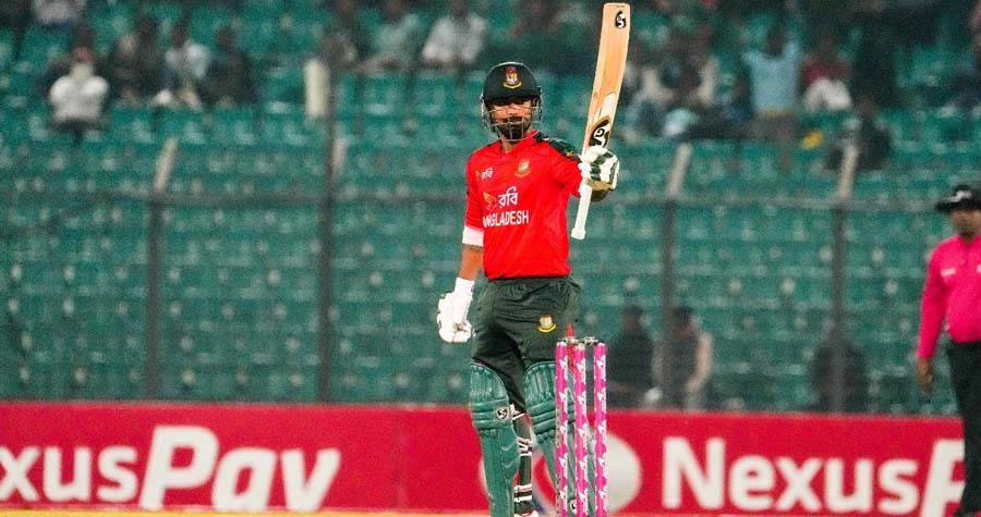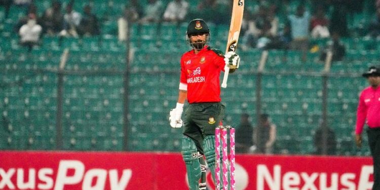 প্রথমে বড় লক্ষ্য তাড়া করতে গিয়ে বাংলাদেশ শুরুটা ভালো করলেও ৭ রান করে রান আউটের মাধ্যমে তানজিদ তামিম ফিরলে উদ্বোধনী জুটি ভেঙে পড়ে ২৬ রানে। তামিম দ্রুত ফেরলেও ওপেনার পারভেজ হোসেন ইমন দারুণ ব্যাটিং দেখান, ২৮ বলে ৪৩ রান করে দলের আশা জোগান। এরপর তিনে নামা লিটন দাস ফিফটি করে দলের জয়ের মূল ভিত্তি স্থাপন করেন। ৩৪ বলে ৫৭ রান করেন তিনি, ও দায়িত্ব নিয়ে ব্যাটিং চালিয়ে যান অধিনায়ক।