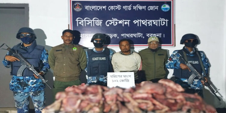 বর্ণনা করেন, স্থানীয় গোপন সংবাদের ভিত্তিতে মধ্যরাতের দিকে, বিশেষ এক অভিযানে কোস্ট গার্ডের সদস্যরা বরগুনার পাথরঘাটার কাঠালতলী গ্রামে পৌঁছায়। সেখানে তারা এক শিকারিকে ১০২ কেজি হরিণের মাংসসহ আটক করে। পরে এই হরিণের মাংস ও আটক ব্যক্তিকে বন বিভাগের কাছে হস্তান্তর করা হয়, যেন আইনানুগ ব্যবস্থা নেয়া হয়।