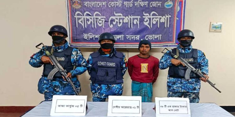 সোমবার (২৯ ডিসেম্বর) সকালে কোস্ট গার্ডের মিডিয়া কর্মকর্তা লেফটেন্যান্ট কমান্ডার সিয়াম-উল-হক এ তথ্য নিশ্চিত করেন। তিনি বলেন, গোপন সংবাদের ভিত্তিতে রোববার (২৮ ডিসেম্বর) বিকেল ৫টার দিকে কোস্ট গার্ড স্টেশনের নেতৃত্বে ভোলা সদর থানাধীন মাঝেরচর এলাকার এক বিশেষ অভিযানে মো. আরমান (১৯) নামে এক যুবককে আটক করা হয়। অভিযানের সময় তার কাছ থেকে একটি দেশীয় আগ্নেয়াস্ত্র, পাঁচটি তাজা কার্তুজ এবং আট হাজার টাকার জাল নোট উদ্ধার করা হয়।