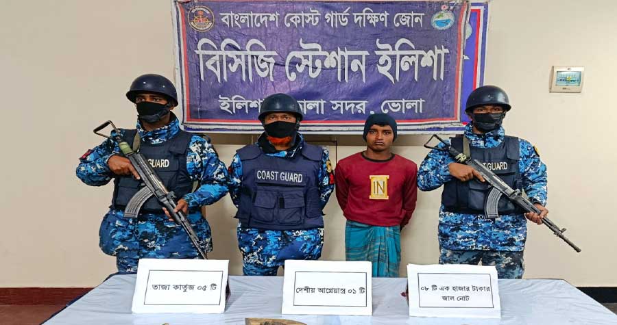 সোমবার (২৯ ডিসেম্বর) সকালে কোস্ট গার্ডের মিডিয়া কর্মকর্তা লেফটেন্যান্ট কমান্ডার সিয়াম-উল-হক এ তথ্য নিশ্চিত করেন। তিনি বলেন, গোপন সংবাদের ভিত্তিতে রোববার (২৮ ডিসেম্বর) বিকেল ৫টার দিকে কোস্ট গার্ড স্টেশনের নেতৃত্বে ভোলা সদর থানাধীন মাঝেরচর এলাকার এক বিশেষ অভিযানে মো. আরমান (১৯) নামে এক যুবককে আটক করা হয়। অভিযানের সময় তার কাছ থেকে একটি দেশীয় আগ্নেয়াস্ত্র, পাঁচটি তাজা কার্তুজ এবং আট হাজার টাকার জাল নোট উদ্ধার করা হয়।