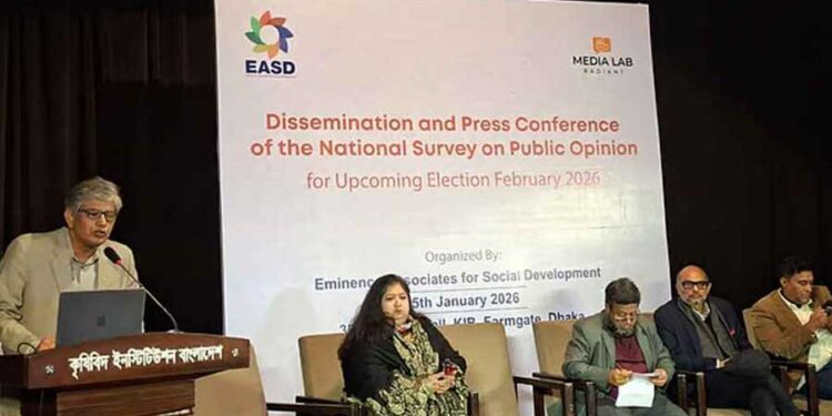 আসন্ন ত্রয়োদশ জাতীয় সংসদ নির্বাচনে মোট ৭০ শতাংশ ভোটার বিশ্বাস করেন, বিএনপিই হবে নির্বাচনের বিজয়ী দল। অন্যদিকে, জামায়াতে ইসলামীর পক্ষে জনমতের মাত্র ১৯ শতাংশ। এই জরিপটি পরিচালনা করেছে বেসরকারি সংস্থা এমিনেন্স অ্যাসোসিয়েটস ফর সোশ্যাল ডেভেলপমেন্ট (ইএএসডি)। সোমবার (৫ জানুয়ারি) বিকেলে রাজধানীর ফার্মগেটে কেআইবি মিলনায়তনে এই জরিপের ফলাফল প্রকাশ করেন ইএএসডির প্রধান নির্বাহী কর্মকর্তা শামীম হায়দার তালুকদার। তিনি জানান, দেশের মোট ৩০০টি সংসদীয় আসন থেকে সরাসরি ২০,০৪৫ জনের মতামত সংগ্রহ করা হয়েছে, যা গত বছরের ২০ ডিসেম্বর থেকে শুরু করে ১ জানুয়ারি পর্যন্ত চলেছে।