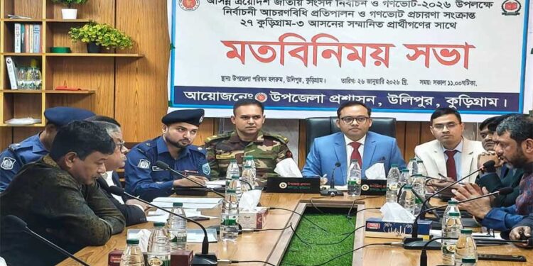 কুড়িগ্রামের উলিপুরে নির্বাচনী আচরণবিধি অনুসরণ ও আসন্ন গণভোট প্রচারণা নিয়ে একটি মতবিনিময় সভা অনুষ্ঠিত হয়েছে। রবিবার (২৬ জানুয়ারি) দুপুরে উপজেলা প্রশাসনের আয়োজনে উপজেলা পরিষদ হলরুমে এ আলোচনা সভার আয়োজন করা হয়।
