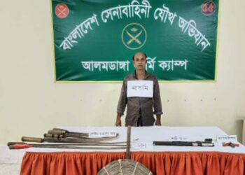 Read moreচুয়াডাঙ্গার আলমডাঙ্গা উপজেলার কেশবপুর পূর্বপাড়ায় যৌথ বাহিনীর অভিযান চালিয়ে অস্ত্র ও একজন যুবককে আটক করা হয়েছে। শুক্রবার (৩ অক্টোবর) দিবাগত...